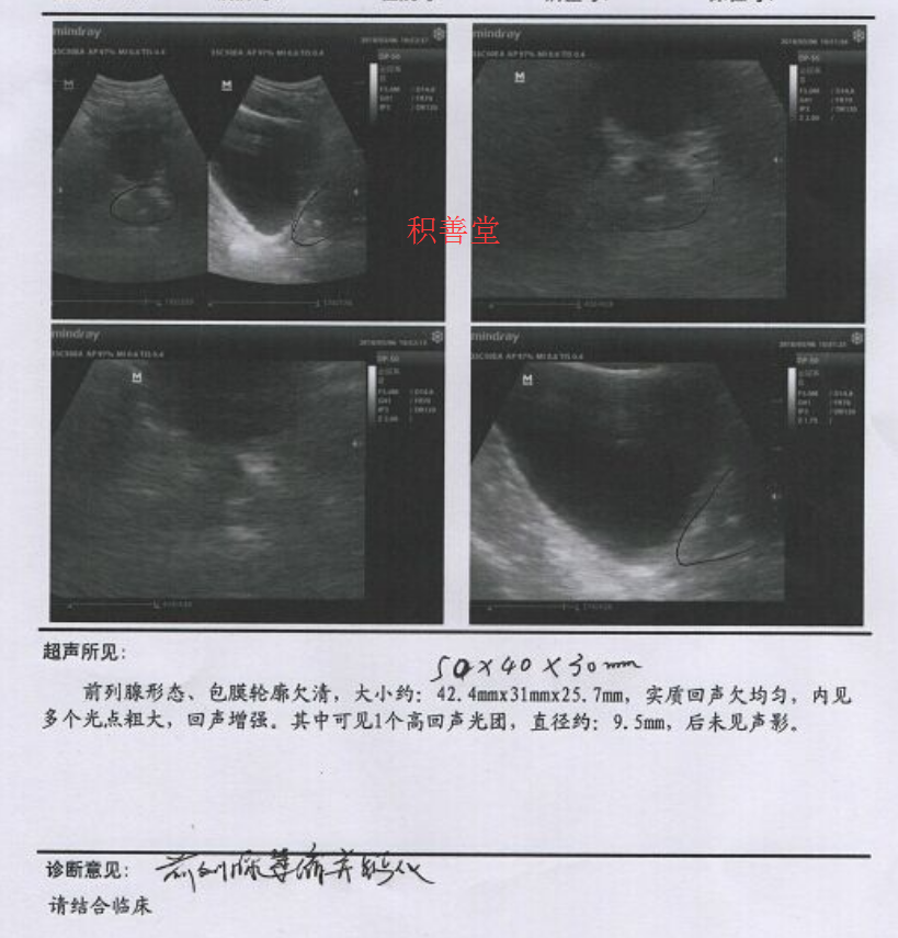 他的B超检查显示:前列腺形态正常,包膜轮廓清晰,大小约:42.4mmx31mmx25.7mm,实质回声欠均匀,内见多个光斑粗大,回声增强。其中可见1个高回声光团,直径约:9.5mm,后未见声影。