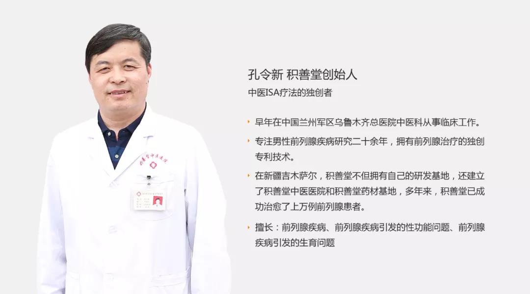 作为壹家“年富力强”的中医医院,积善堂已经走过了11个春秋,从最初掘起于天山脚下,到如今门诊遍布全国重点城市,早已声名远播。在院长孔令新的带领下,积善堂运用独创的ISA中医药疗法,成功治愈了包括意大利、哈萨克斯坦、吉尔吉斯斯坦和国内的上万名前列腺疾病患者,为中医药事业的发展做出了重大贡献。