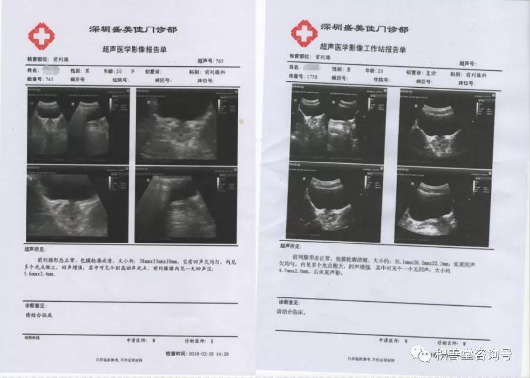这位患者首诊时,最突出的表现是体质非常虚弱,频繁遗精,胃肠不好,稀便,干呕。B超下前列腺有钙化点和囊肿,并伴有前列腺疾病常见的排尿和疼痛症状。