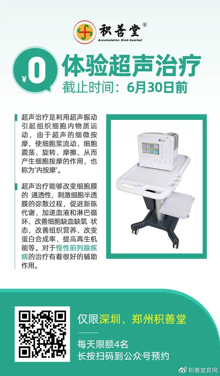 为了让更多的病友抓住时机,改善自己的病情,积善堂为病友们提供免费的超声治疗,目前仅限于深圳、郑州积善堂。