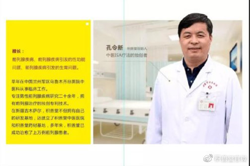 孔令新,原兰州军区乌鲁木齐总医院副团级军医、积善堂创始人、积善堂中医医院创办者、中医治疗前列腺特效技术ISA(渗透-软化-激活)疗法发明人。由孔令新医生发明的ISA疗法,不仅能够迅速改善前列腺疾病引起的各种症状,更能让增生(肥大)、萎缩、钙化的前列腺,实现器质性的逆转。凭此“独门绝技”,“积善堂”这一品牌,已经走出新疆,在深圳、郑州等地,设立了临床应用基地,在全国享有一定的知名度。