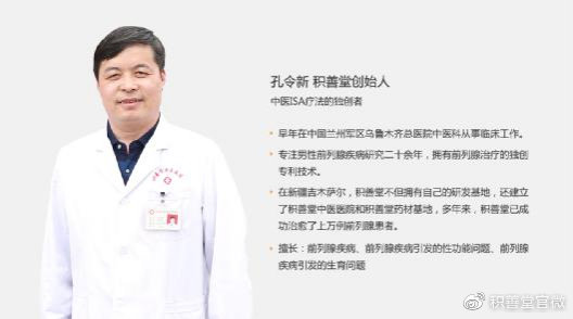 孔令新,原兰州军区乌鲁木齐总医院副团级军医、积善堂创始人、积善堂中医医院创办者、中医治疗前列腺特效技术ISA(渗透-软化-激活)疗法发明人。由孔令新医生发明的ISA疗法,不仅能够迅速改善前列腺疾病引起的各种症状,更能让增生(肥大)、萎缩、钙化的前列腺,实现器质性的逆转。凭此“独门绝技”,“积善堂”这一品牌,已经走出新疆,在深圳、郑州等地,设立了临床应用基地,在全国享有一定的知名度。